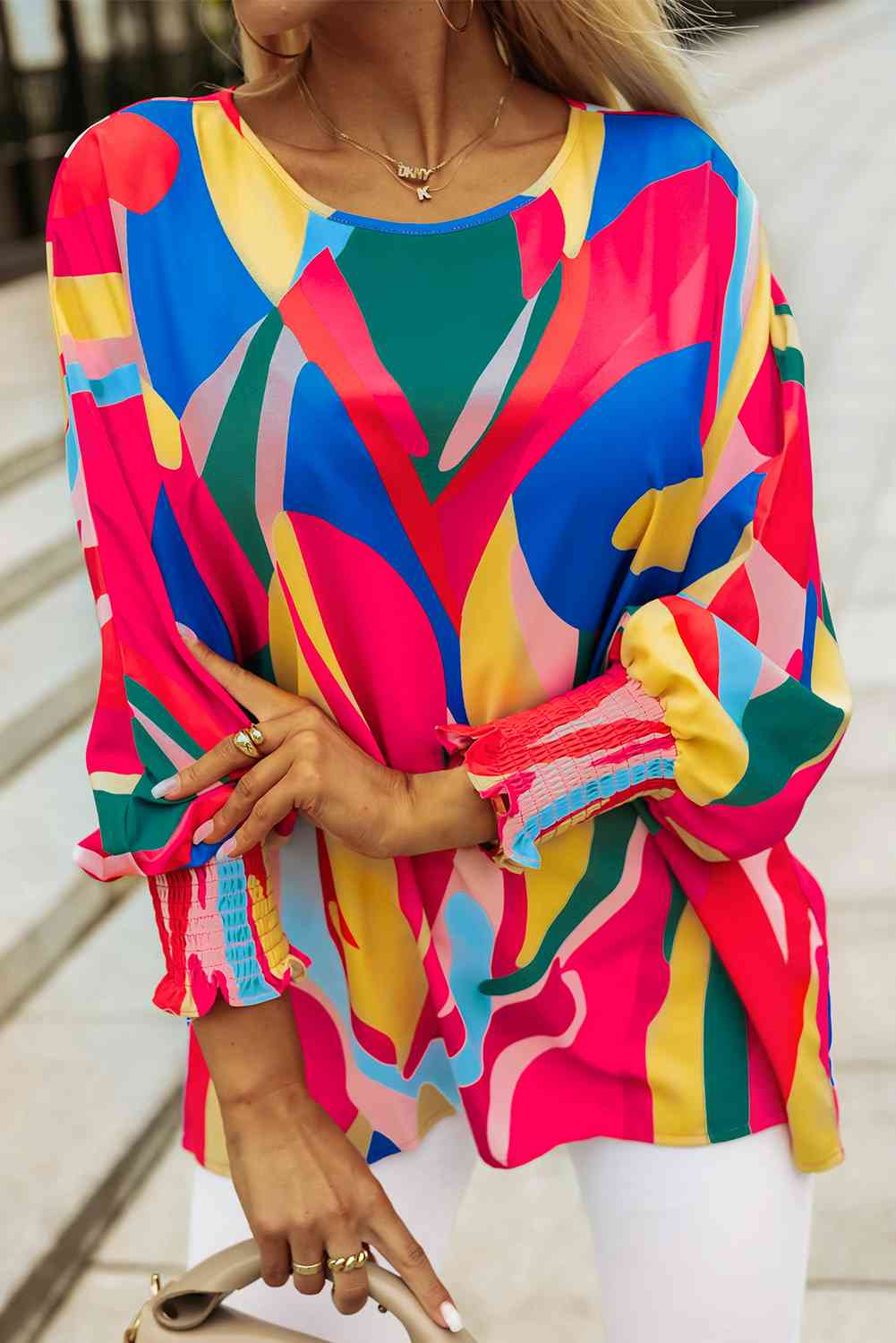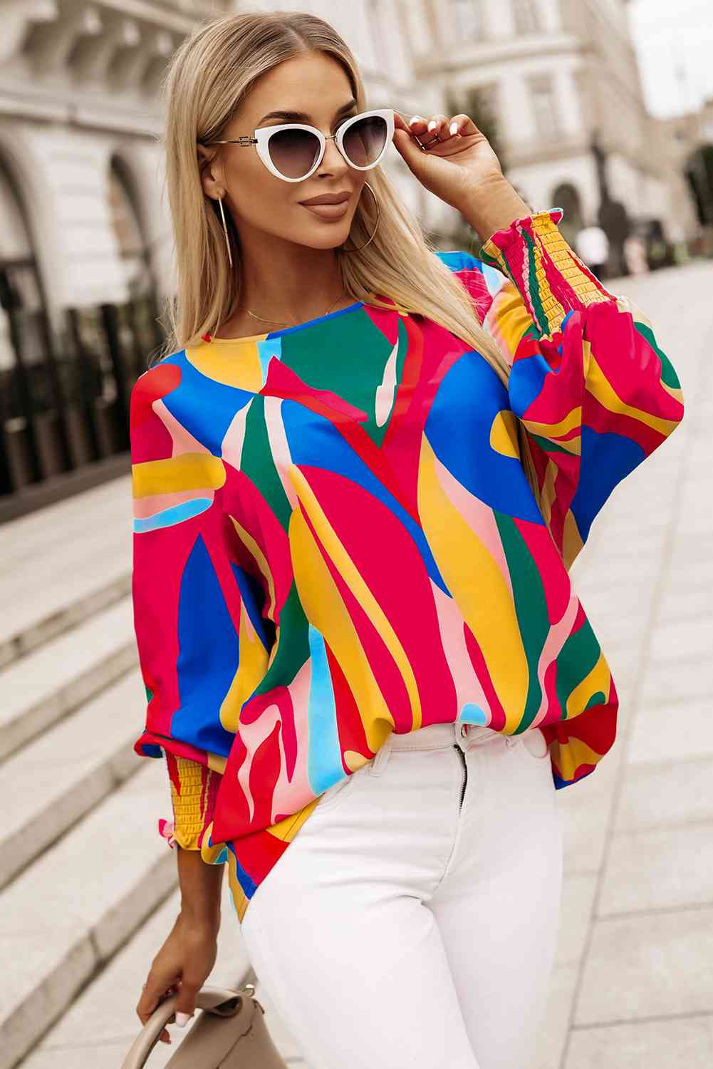 Printed Round Neck Smocked Wrist Lantern Sleeve Blouse