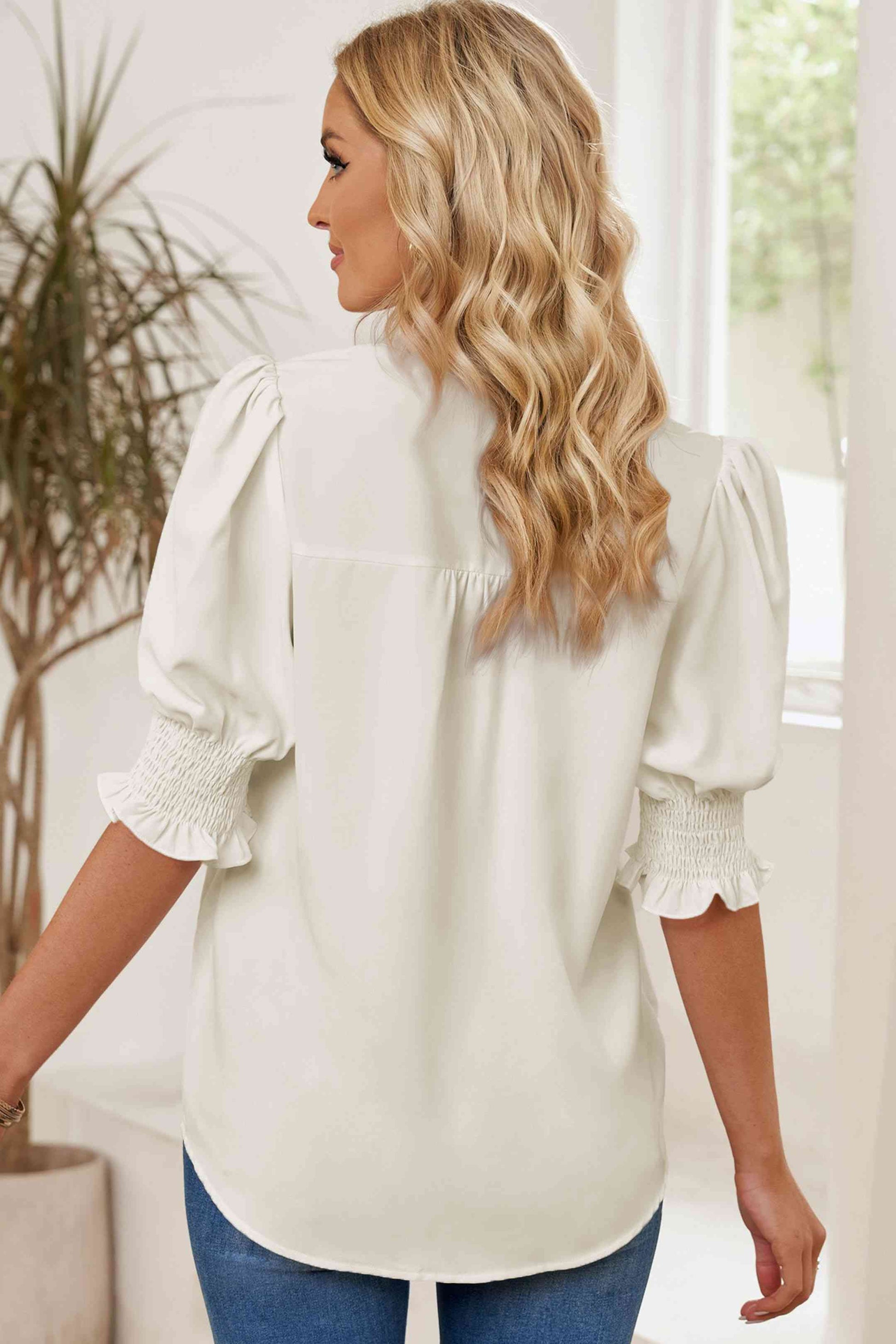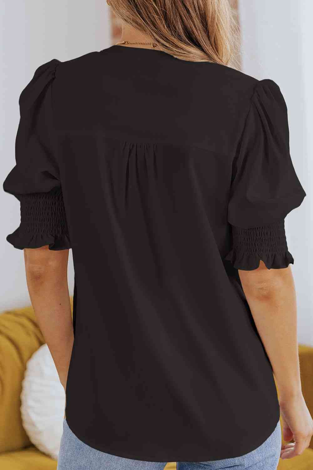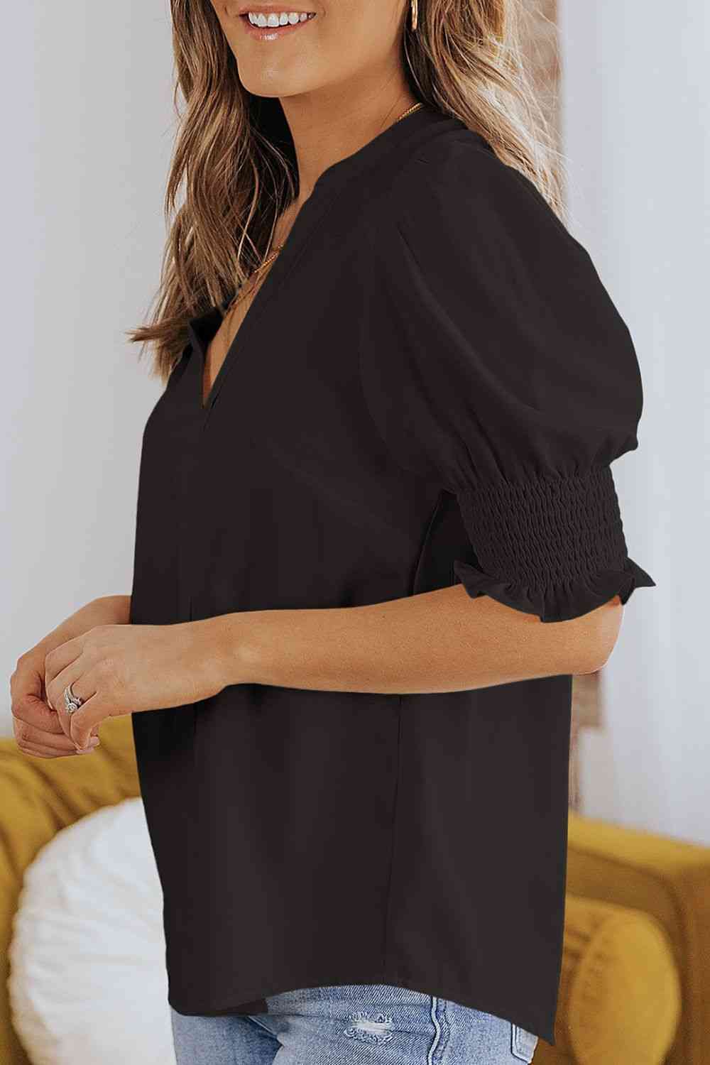 Smocked Flounce Sleeve Notched Neck Blouse