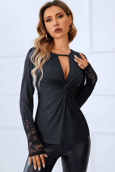 Twisted Cutout Lace Detail Long Sleeve Blouse